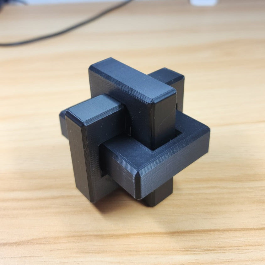 Este rompecabezas está formado por tres piezas que deben ensamblarse cuidadosamente hasta formar una estructura en cruz tridimensional.